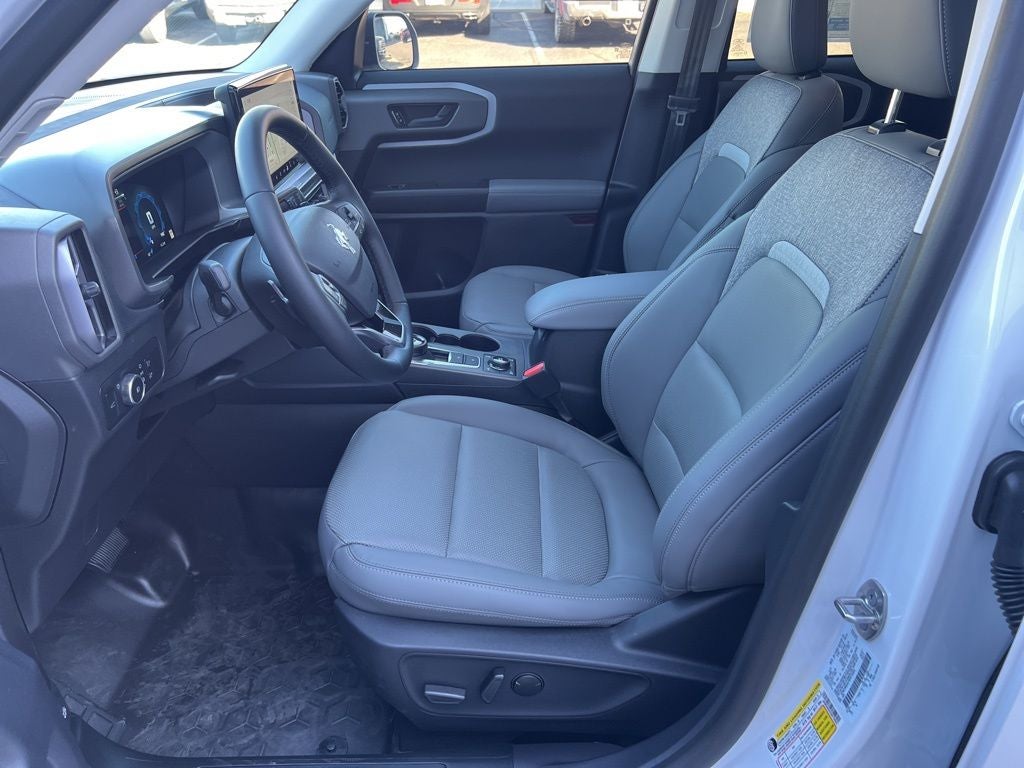 Oxford White 2025 Ford Bronco Sport Badlands 4WD 8-Speed Automatic EcoBoost 2.0L I4 GTDi DOHC Turbocharged VCT 4-Wheel Disc Brakes, 6 Speakers, ABS brakes, Air Conditioning, Alloy wheels, AM/FM radio: SiriusXM, AM/FM Stereo, Auto High-beam Headlights, Auto-dimming Rear-View mirror, Automatic temperature control, Brake assist, Compass, Delay-off headlights, Driver door bin, Driver vanity mirror, Dual front impact airbags, Dual front side impact airbags, Electronic Stability Control, Emergency communication system: SYNC 4 911 Assist, Four wheel independent suspension, Front anti-roll bar, Front Bucket Seats, Front Center Armrest, Front fog lights, Front reading lights, Fully automatic headlights, Garage door transmitter, Heated door mirrors, Heated front seats, Heated steering wheel, Illuminated entry, Knee airbag, Leather Trimmed Front Bucket Seats, Low tire pressure warning, Memory seat, Occupant sensing airbag, Outside temperature display, Overhead airbag, Overhead console, Panic alarm, Passenger door bin, Passenger vanity mirror, Power door mirrors, Power driver seat, Power passenger seat, Power steering, Power windows, Radio data system, Rear anti-roll bar, Rear reading lights, Rear seat center armrest, Rear window defroster, Rear window wiper, Remote keyless entry, Security system, SiriusXM, Speed control, Speed-sensing steering, Speed-Sensitive Wipers, Split folding rear seat, Steering wheel mounted audio controls, SYNC 4 w/Enhanced Voice Recognition, Tachometer, Telescoping steering wheel, Tilt steering wheel, Traction control, Trip computer, Variably intermittent wipers, and Wheels: 17 Matte Black-Painted Aluminum.