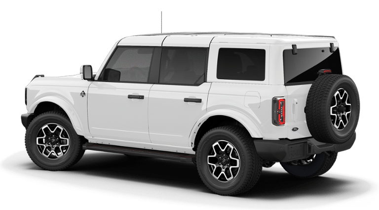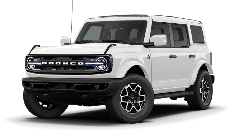 Oxford White 2026 Ford Bronco Outer Banks 4WD 10-Speed Automatic 2.7L EcoBoost V6 Ford Connectivity Package (1-Year Included), 18 Bright Machined Aluminum Wheels, 3.73 Axle Ratio, 4-Wheel Disc Brakes, 7 Speakers, ABS brakes, Air Conditioning, Alloy wheels, AM/FM radio: SiriusXM with 360L, AM/FM Stereo, Auto High-beam Headlights, Auto-dimming Rear-View mirror, Automatic temperature control, Brake assist, Compass, Connected Navigation, Delay-off headlights, Driver door bin, Driver vanity mirror, Dual front impact airbags, Dual front side impact airbags, Electronic Stability Control, Emergency communication system: 911 Assist, Exterior Parking Camera Rear, Front anti-roll bar, Front Bucket Seats, Front Center Armrest, Front dual zone A/C, Front fog lights, Front reading lights, Front wheel independent suspension, Fully automatic headlights, Heated door mirrors, Heated front seats, Heated Leather-Trimmed/Vinyl Bucket Seats, Heated steering wheel, Illuminated entry, Integrated roll-over protection, Leather Shift Knob, Low tire pressure warning, Navigation system: Connected Navigation, Occupant sensing airbag, Outside temperature display, Overhead airbag, Overhead console, Panic alarm, Passenger door bin, Passenger vanity mirror, Power door mirrors, Power driver seat, Power passenger seat, Power steering, Power windows, Radio data system, Rear seat center armrest, Remote keyless entry, Security system, SiriusXM with 360L, Speed control, Split folding rear seat, Steering wheel mounted audio controls, SYNC 4, Tachometer, Telescoping steering wheel, Tilt steering wheel, Traction control, Trip computer, Variably intermittent wipers, and Voltmeter.