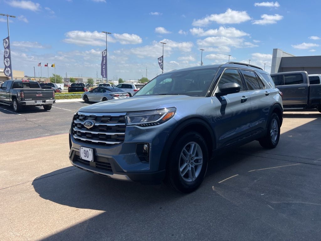 Blue 2026 Ford Explorer Active RWD 10-Speed Automatic 2.3L EcoBoost I-4 3rd row seats: bench, 4-Wheel Disc Brakes, 6 Speakers, ABS brakes, Air Conditioning, Alloy wheels, AM/FM radio: SiriusXM with 360L, AM/FM Stereo, Apple CarPlay/Android Auto, Auto High-beam Headlights, Automatic temperature control, Brake assist, Bumpers: body-color, Compass, Delay-off headlights, Driver door bin, Driver vanity mirror, Dual front impact airbags, Dual front side impact airbags, Electronic Stability Control, Emergency communication system: 911 Assist, Exterior Parking Camera Rear, Four wheel independent suspension, Front anti-roll bar, Front Bucket Seats, Front Center Armrest, Front dual zone A/C, Front reading lights, Fully automatic headlights, Heated door mirrors, Illuminated entry, Knee airbag, Low tire pressure warning, Navigation System, Occupant sensing airbag, Outside temperature display, Overhead airbag, Overhead console, Panic alarm, Passenger door bin, Passenger vanity mirror, Power door mirrors, Power driver seat, Power steering, Power windows, Rear air conditioning, Rear anti-roll bar, Rear reading lights, Rear window defroster, Rear window wiper, Remote keyless entry, Security system, Speed control, Speed-sensing steering, Speed-Sensitive Wipers, Split folding rear seat, Spoiler, Steering wheel mounted audio controls, Tachometer, Telescoping steering wheel, Tilt steering wheel, Traction control, Trip computer, Variably intermittent wipers, and Wheels: 18 Sparkle Silver-Painted Aluminum.