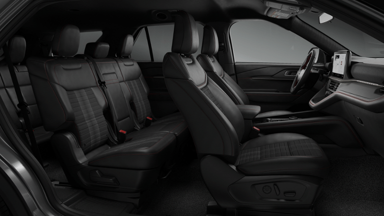 Carbonized Gray Metallic 2026 Ford Explorer ST-Line RWD 10-Speed Automatic 2.3L EcoBoost I-4 10 Speakers, 3rd row seats: bench, 4-Wheel Disc Brakes, ABS brakes, Air Conditioning, Alloy wheels, AM/FM radio: SiriusXM with 360L, Apple CarPlay/Android Auto, Auto High-beam Headlights, Automatic temperature control, Brake assist, Bumpers: body-color, Compass, Delay-off headlights, Driver door bin, Driver vanity mirror, Dual front impact airbags, Dual front side impact airbags, Electronic Stability Control, Emergency communication system: 911 Assist, Exterior Parking Camera Rear, Four wheel independent suspension, Front anti-roll bar, Front Bucket Seats, Front Center Armrest, Front dual zone A/C, Front fog lights, Front reading lights, Fully automatic headlights, Garage door transmitter, Heated door mirrors, Heated front seats, Heated steering wheel, Heated Unique Cloth Captain's Chairs, Illuminated entry, Knee airbag, Leather steering wheel, Low tire pressure warning, Navigation System, Occupant sensing airbag, Outside temperature display, Overhead airbag, Overhead console, Panic alarm, Passenger door bin, Passenger vanity mirror, Power door mirrors, Power driver seat, Power Liftgate, Power passenger seat, Power steering, Power windows, Radio: B&O Sound System by Bang and Olufsen, Rear air conditioning, Rear anti-roll bar, Rear reading lights, Rear window defroster, Rear window wiper, Remote keyless entry, Security system, Speed control, Speed-sensing steering, Speed-Sensitive Wipers, Split folding rear seat, Spoiler, Steering wheel mounted audio controls, Tachometer, Telescoping steering wheel, Tilt steering wheel, Traction control, Trip computer, Variably intermittent wipers, and Wheels: 20 Ebony-Painted Machined Aluminum.
