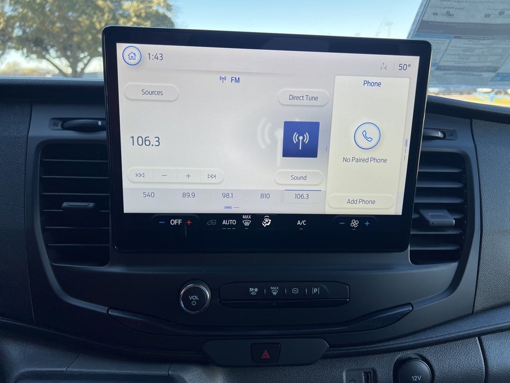 Oxford White 2026 Ford Transit-250 RWD 10-Speed Automatic with Overdrive 3.5L V6 Flex Fuel Ford Connectivity Package (1-Year Included), 3.73 Axle Ratio, 4 Speakers, 4-Wheel Disc Brakes, ABS brakes, Air Conditioning, AM/FM radio, AM/FM Stereo, Apple CarPlay/Android Auto, Auto High-beam Headlights, Brake assist, Dark Palazzo Gray Vinyl Bucket Seats, Delay-off headlights, Driver door bin, Driver's Seat Mounted Armrest, Dual front impact airbags, Dual front side impact airbags, Electronic Stability Control, Emergency communication system: 911 Assist, Exterior Parking Camera Rear, Front anti-roll bar, Front Bucket Seats, Front reading lights, Front wheel independent suspension, Fully automatic headlights, Illuminated entry, Low tire pressure warning, Navigation system: Connected Navigation, Occupant sensing airbag, Overhead airbag, Panic alarm, Passenger cancellable airbag, Passenger door bin, Passenger-Side B-Pillar Assist Handle, Power door mirrors, Power steering, Power windows, Remote keyless entry, Speed control, Steering wheel mounted audio controls, SYNC 4, Tachometer, Telescoping steering wheel, Tilt steering wheel, Traction control, Variably intermittent wipers, and Vinyl Front Bucket Seats.